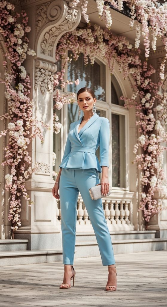 Pastel tones like blush pink, baby blue, mint green, and lavender instantly evoke spring vibes. When paired with nude heels, the look becomes elongated, elegant, and cohesive. This outfit is ideal for those who want something effortless yet polished.