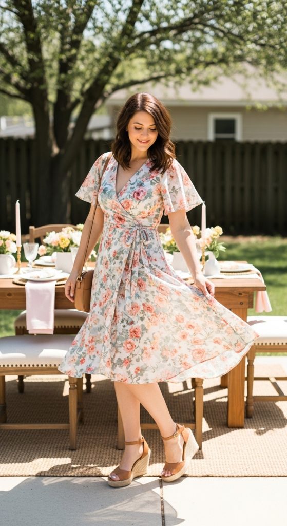 A knee-length or midi floral wrap dress styled with neutral wedge sandals and soft accessories.