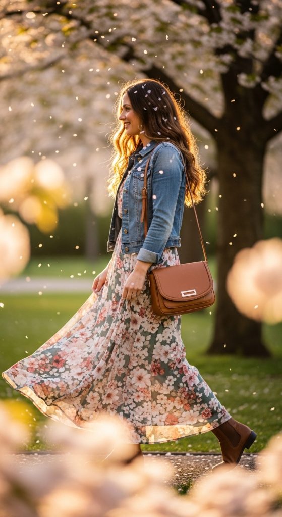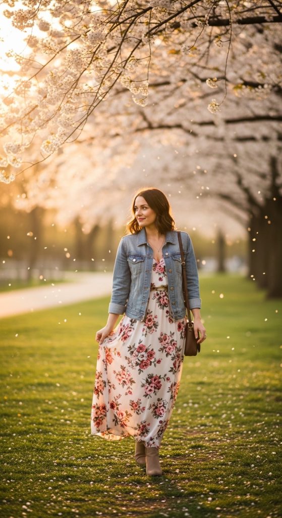 This outfit balances casual and feminine perfectly. A denim jacket makes a floral maxi more relaxed and wearable.