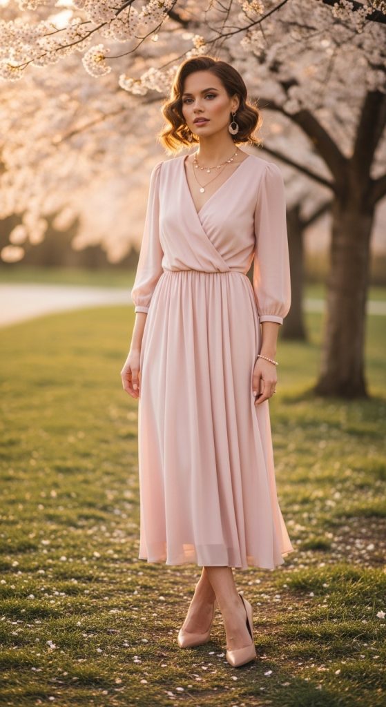 A midi dress that falls between the knee and ankle in a soft pastel color, paired with neutral heels and delicate accessories. It’s simple, elegant, and seasonally appropriate.