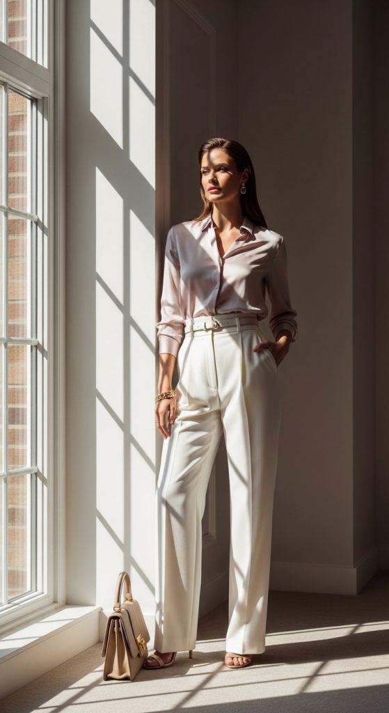 10. Tailored Wide-Leg Pants with Silk Blouse