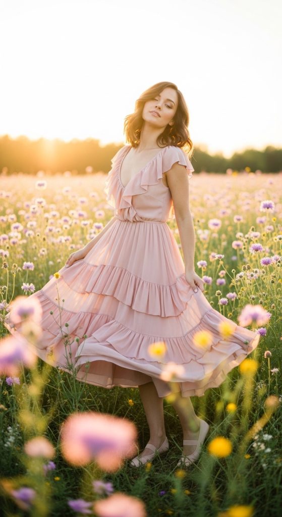 Ruffles add softness and movement. This romantic silhouette feels playful and feminine — ideal for spring celebrations.