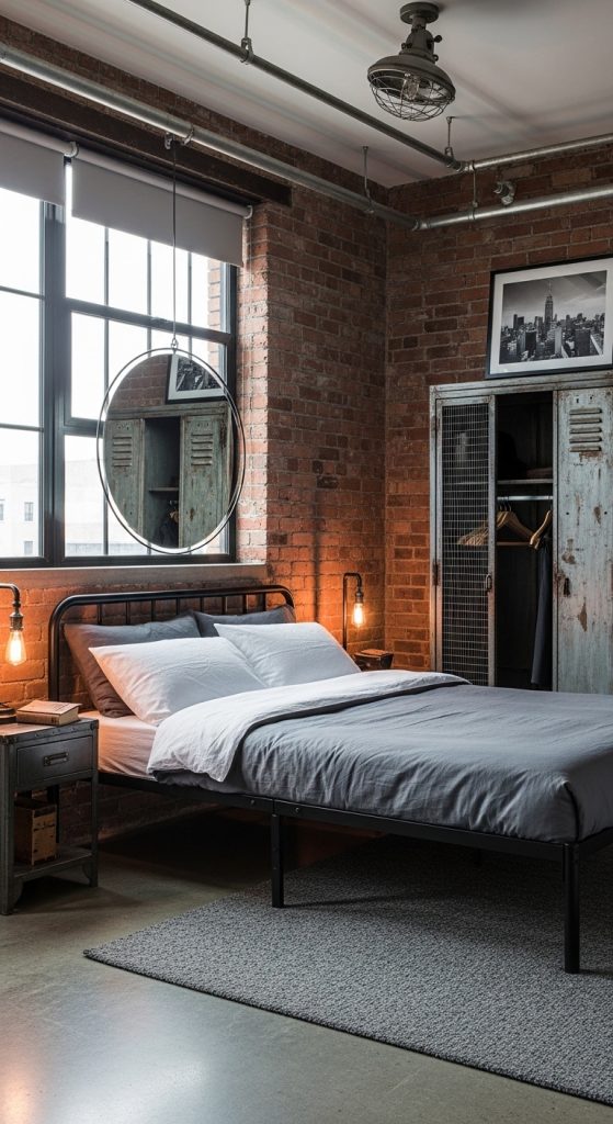 Industrial-style bedrooms feature exposed brick walls, metal furniture, and neutral tones like grey, black, and brown. Incorporate raw textures like concrete or reclaimed wood for an edgy, modern feel. Accent lighting and vintage décor pieces complete the look.