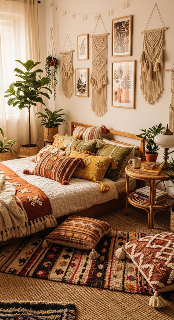 Boho bedrooms are colorful, artistic, and eclectic. Layered rugs, patterned cushions, macramé wall hangings, and plants create a vibrant, relaxed atmosphere. Mix textures, colors, and materials for a cozy, personalized look.
