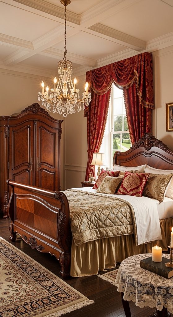 Classic bedrooms feature traditional furniture, elegant patterns, and rich color schemes. Wooden beds, ornate mirrors, chandeliers, and luxurious fabrics evoke a timeless charm. This style works well in spacious bedrooms with high ceilings.