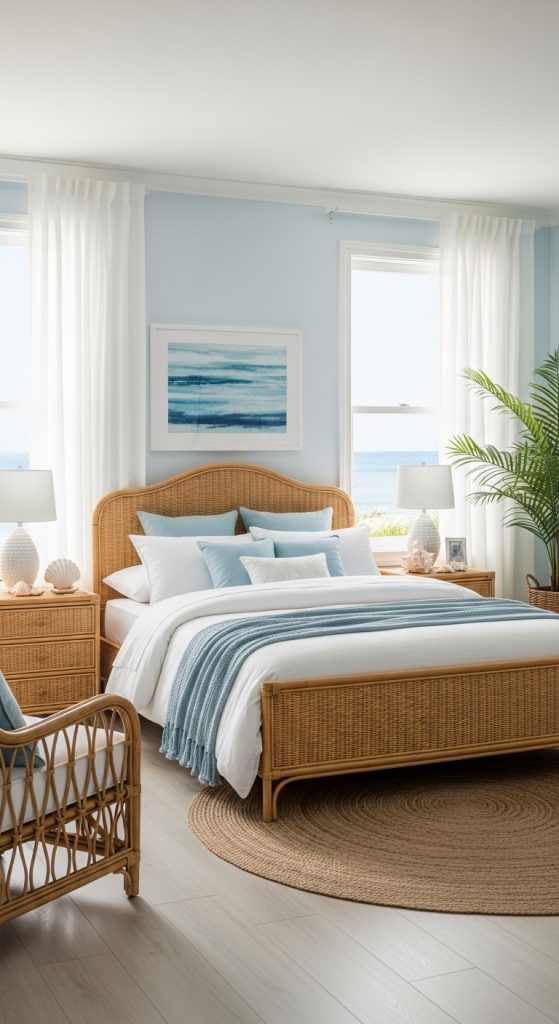 Coastal bedrooms are light, breezy, and relaxing. Whites, blues, and sandy beige tones reflect the seaside vibe. Natural materials like rattan, wicker, or light wood, combined with airy curtains, create a tranquil retreat reminiscent of a beachside escape.