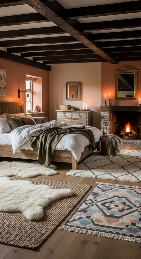 Rustic bedrooms bring warmth and charm with natural materials and textures. Wooden beams, stone accents, and earthy color palettes evoke a cozy, cabin-like feel. Layered rugs, soft throws, and vintage furniture complete the look.