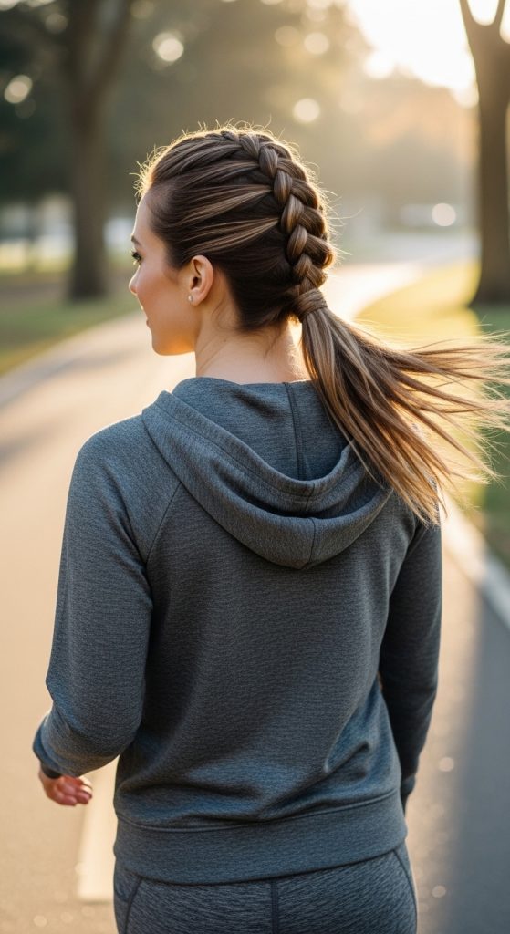 This hairstyle blends elegance with athletic practicality. A French braid along one side flows into a low ponytail, keeping hair secure but adding visual interest.