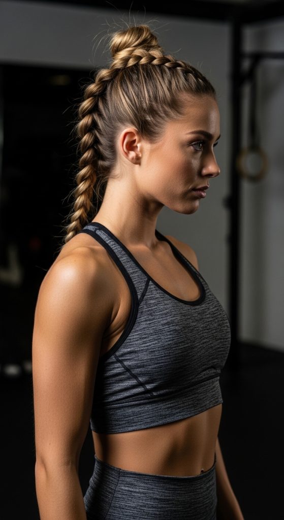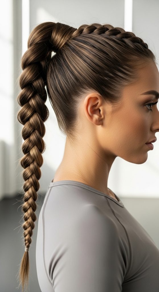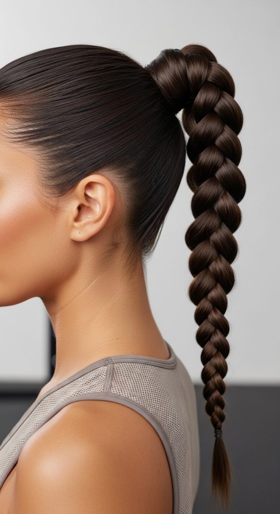 The high braided ponytail combines sleekness and strength. It starts with a secure high ponytail and transforms into a long braid that moves beautifully while staying controlled. This style is perfect for gym workouts, cheer practice, or track sessions.