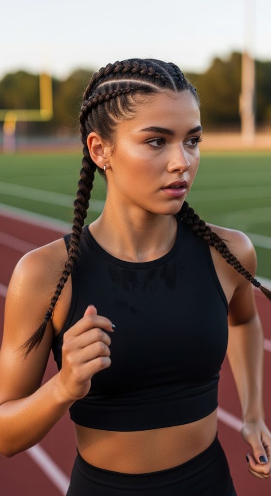 Double Dutch braids are one of the most iconic sporty hairstyles — and for good reason. They’re secure, balanced, and perfect for high-movement activities like running, soccer, volleyball, or dance practice. This style features two inverted braids running along each side of the head, keeping hair tight to the scalp while distributing tension evenly.