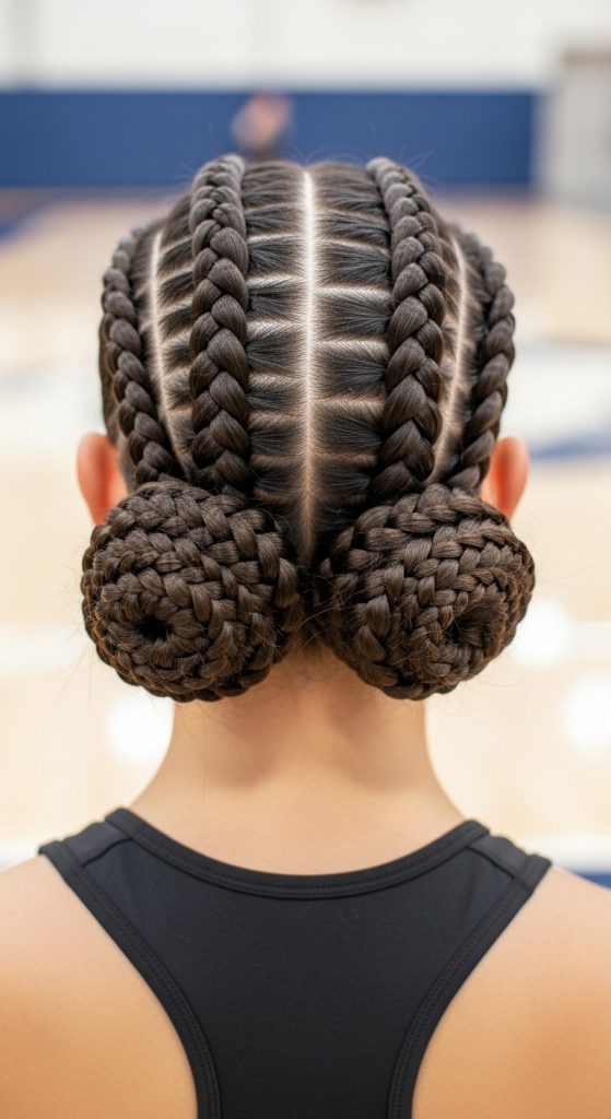 This style is a fun twist on classic boxer braids. Instead of leaving the braids hanging, you wrap them into two small low buns. It’s sporty, secure, and perfect for intense training sessions.
