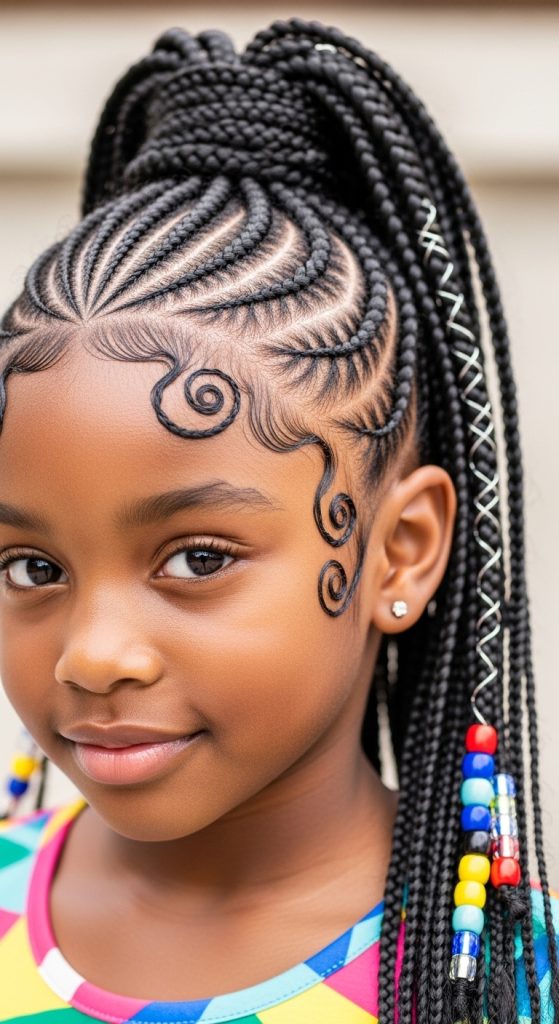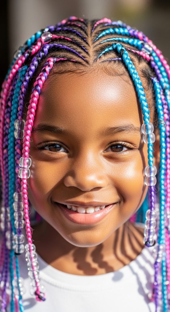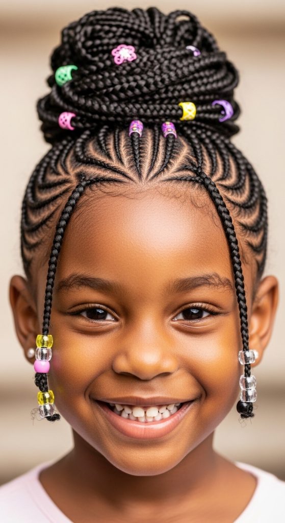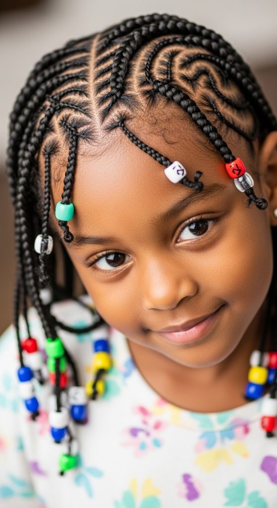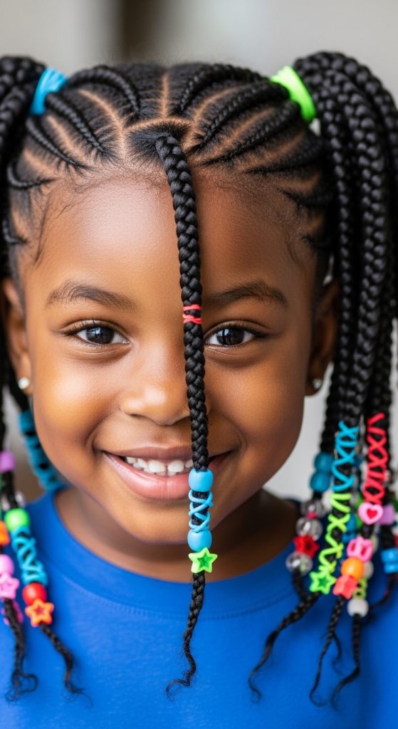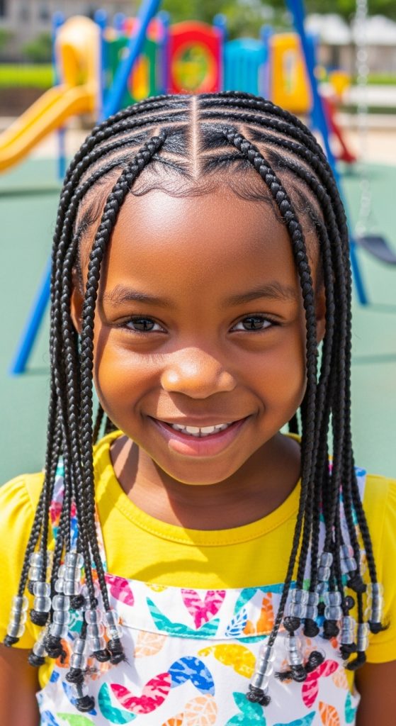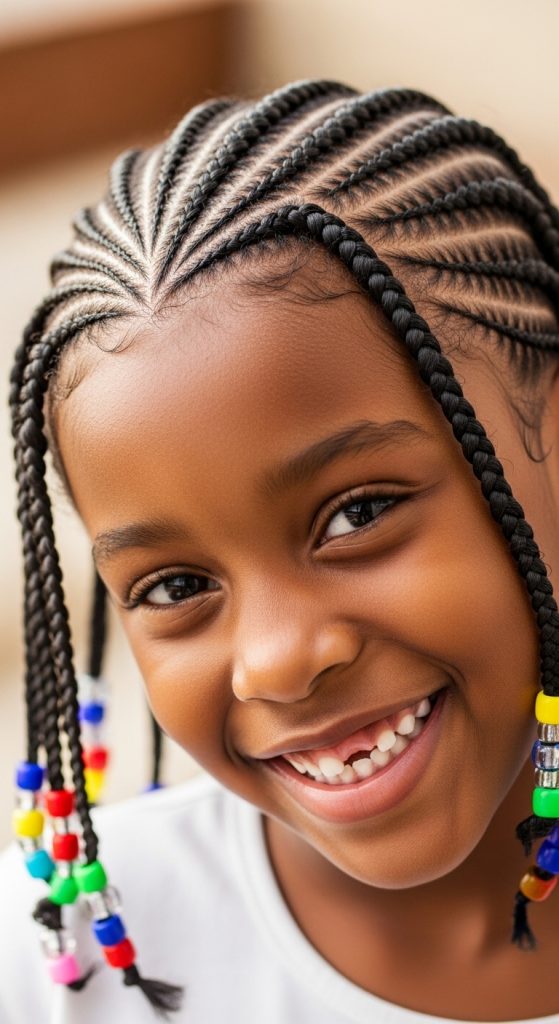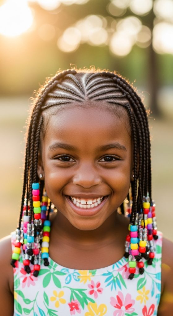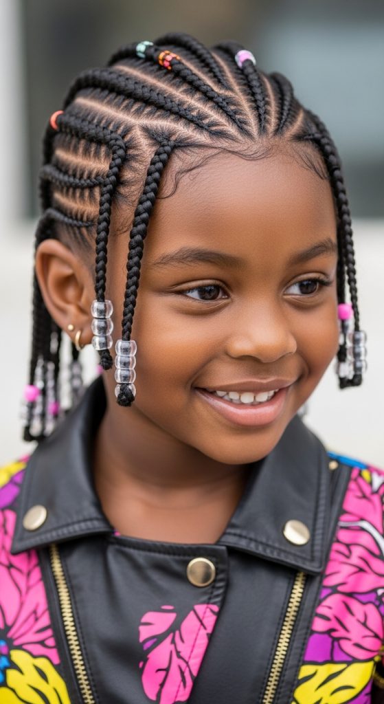 Cornrows with beads create a playful and colorful hairstyle that many kids love. The beads add movement and fun to the braids while still keeping the hairstyle neat and protective.