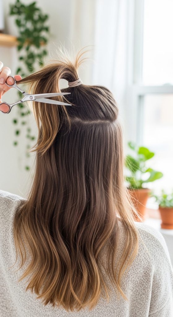 Start by tying your hair into a high ponytail at the front of your head. Gently pull it forward and trim the ends evenly. Release the ponytail and check the layers.