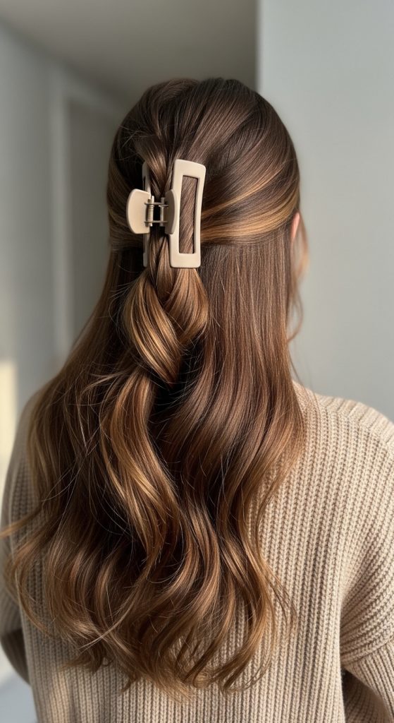 This hairstyle works beautifully on straight or slightly wavy hair and pairs effortlessly with cozy sweaters, casual dresses, or even relaxed office outfits.
