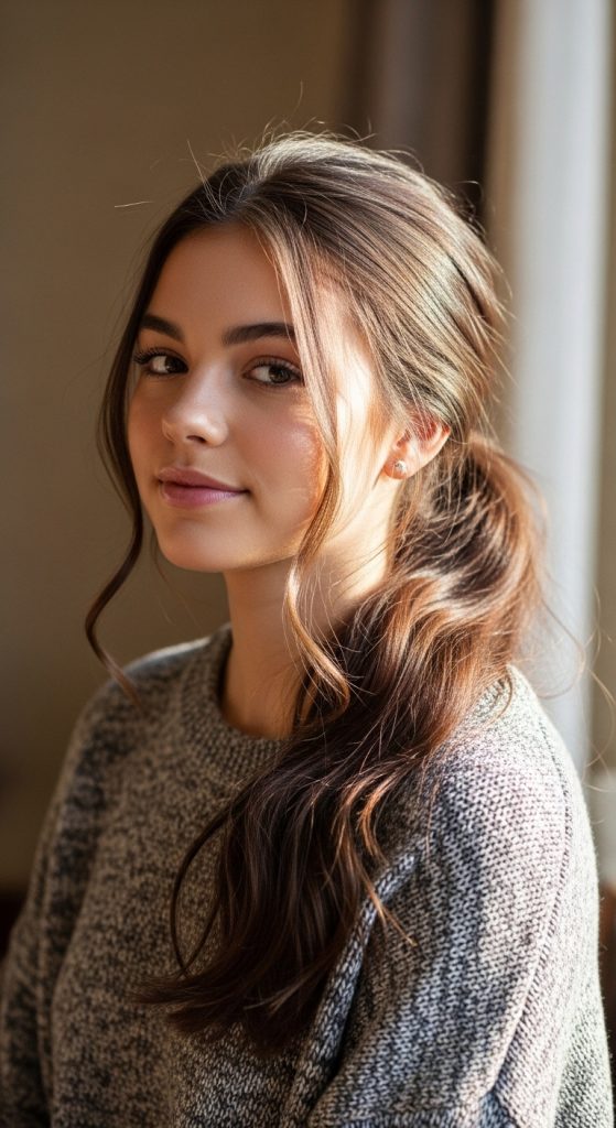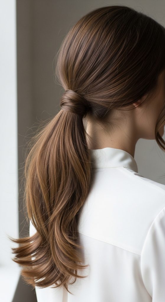 The loose low ponytail is one of the simplest yet most flattering casual hairstyles for long hair. It highlights your length while maintaining softness and movement. Unlike a tight ponytail, this version feels relaxed and airy, making it perfect for everyday wear.