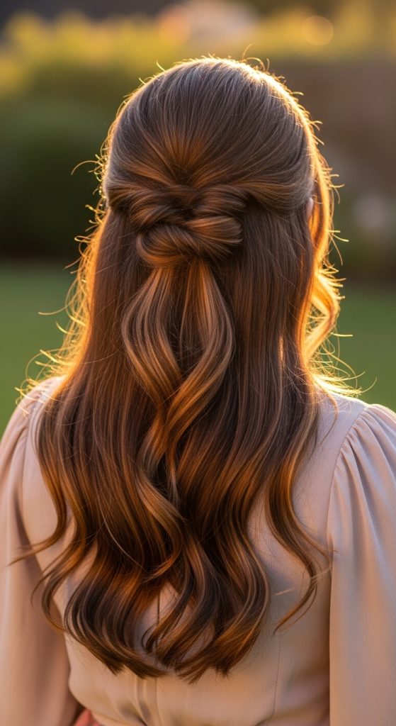 The half-up twisted hairstyle is a go-to casual look for long hair. It keeps hair out of your face while allowing the rest to flow freely down your back.
