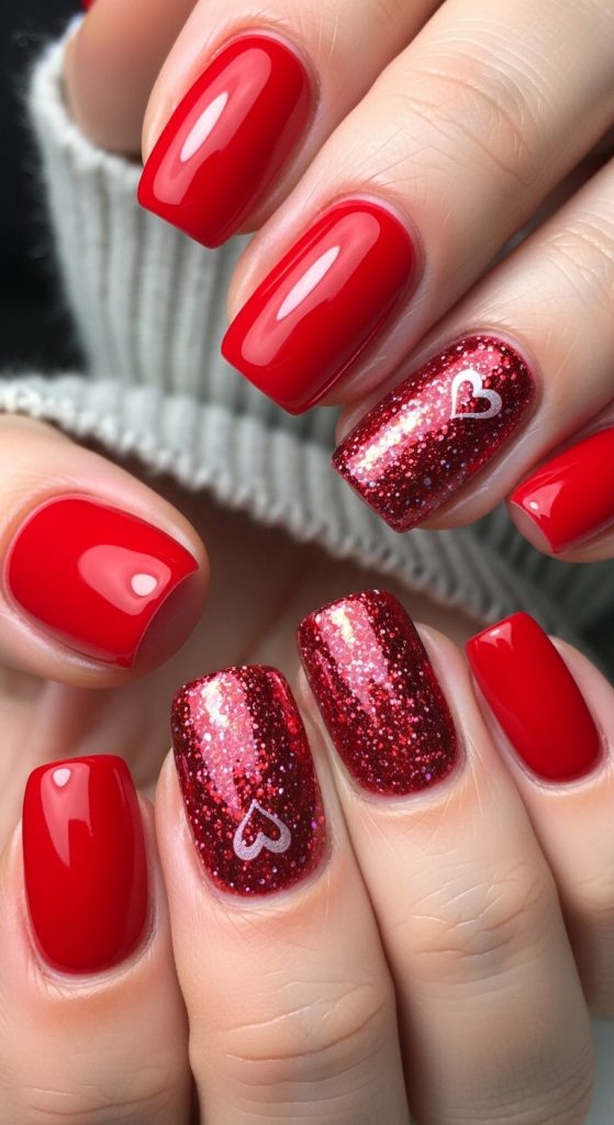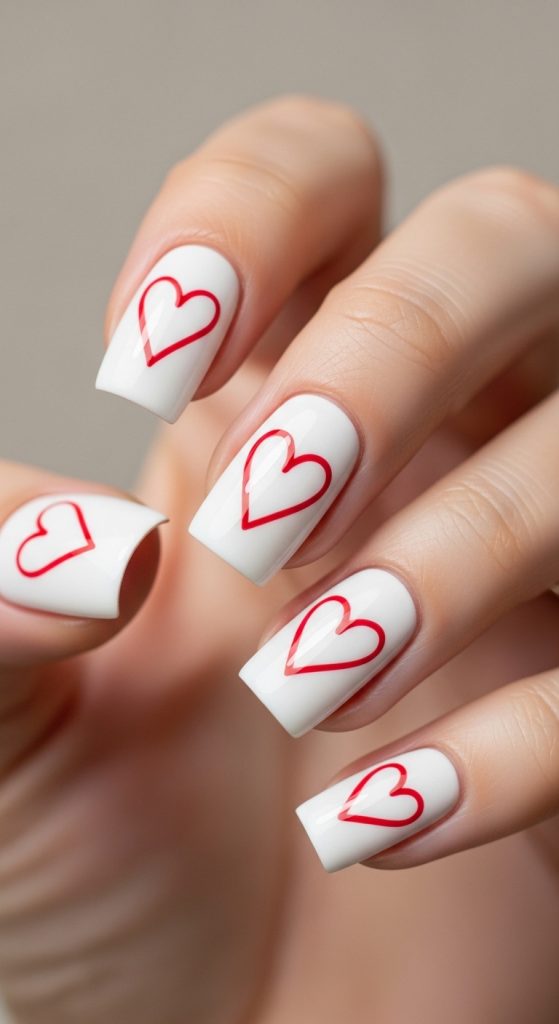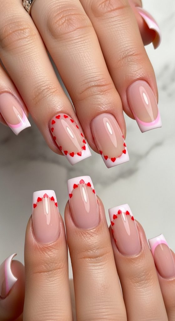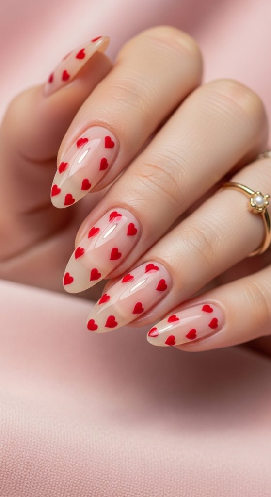 This is the classic cupid-inspired design: a nude or pale pink base with tiny red hearts. It’s minimal, cute, and easy to wear daily.