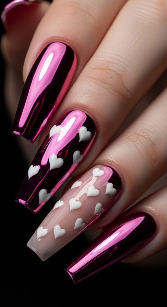Metallic chrome base with small hearts adds glam to cupid nails.