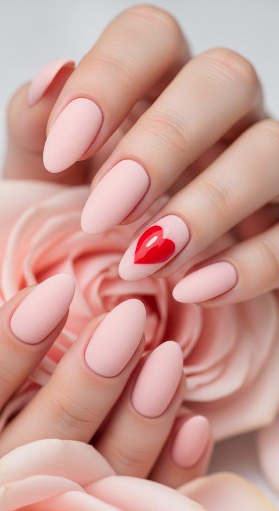 A soft matte blush manicure with one tiny glossy heart creates subtle contrast.