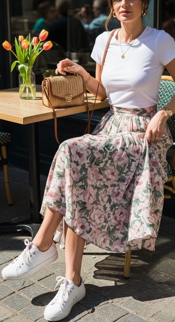 A floral midi skirt styled with a simple white t-shirt is effortlessly feminine yet casual. This combination keeps you comfortable while still looking seasonal and intentional.