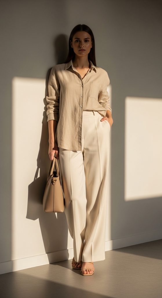 For a minimal aesthetic, a linen button-down shirt paired with wide-leg pants creates a clean, elevated casual look. This outfit feels breathable and refined without trying too hard.