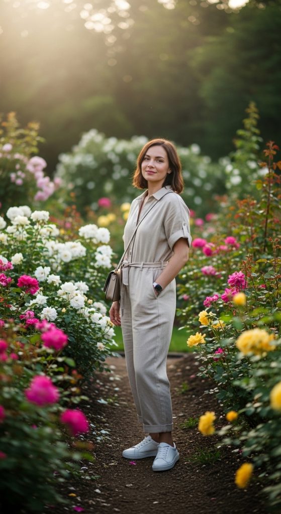 A soft cotton or linen jumpsuit styled with clean white sneakers.