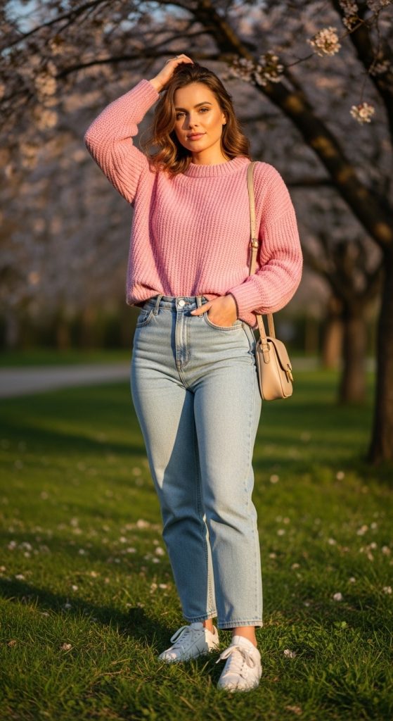A soft pastel knit sweater styled with high-waisted light wash straight-leg jeans and neutral flats or sneakers.