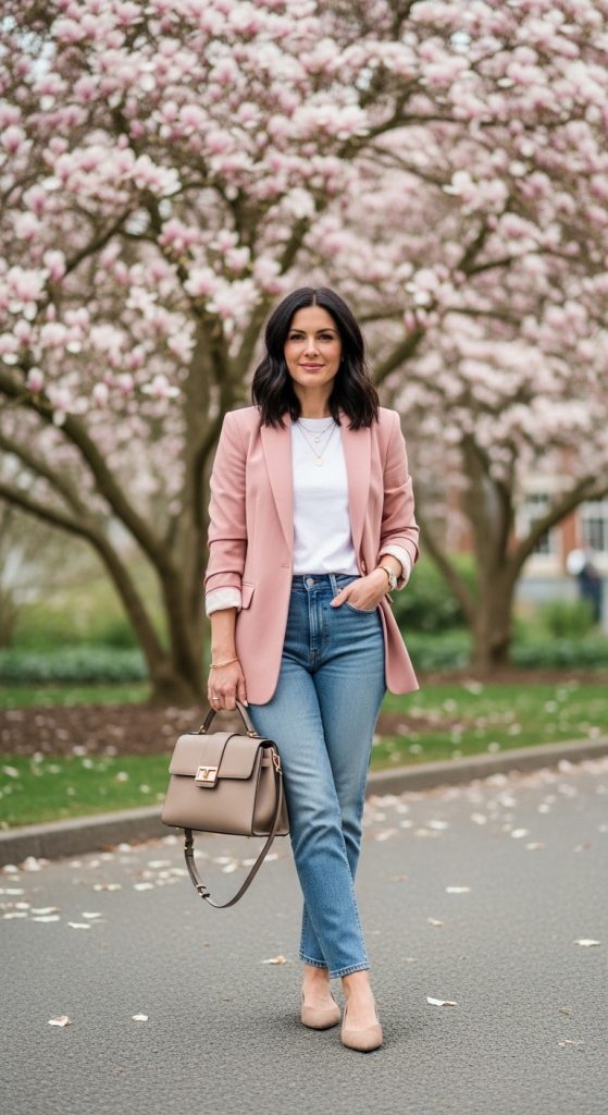 A soft pink or blush blazer styled with a white top and light denim.