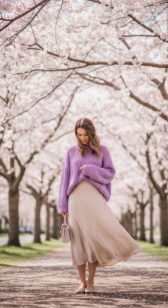 An oversized pastel sweater styled with a flowing midi skirt.