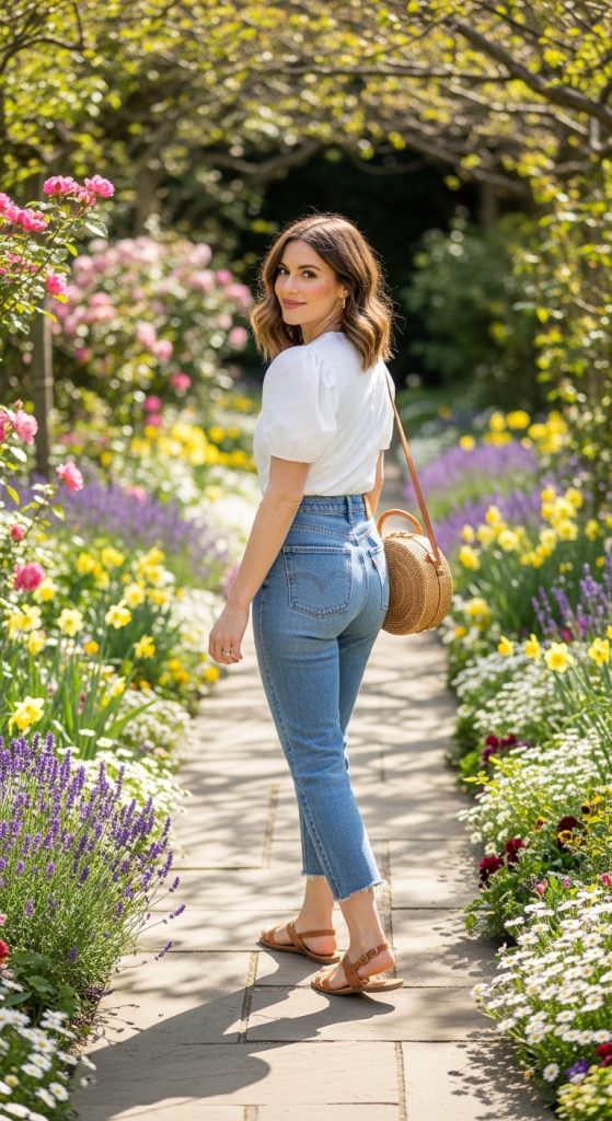 A puff-sleeve or embroidered white blouse styled with cropped jeans.