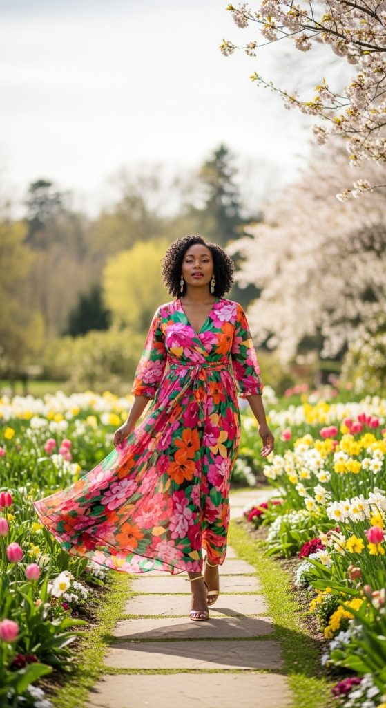Floral prints symbolize spring renewal, making them ideal for Easter. A flowing maxi dress with bold florals offers movement, femininity, and visual impact. For Black women, vibrant floral prints with deep pinks, oranges, blues, and greens create stunning contrast against melanin-rich skin.
