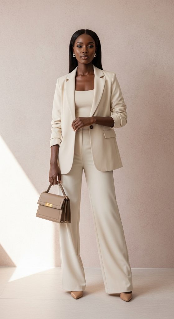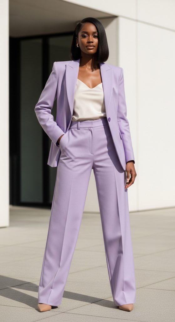A tailored suit in lilac, sage green, peach, or powder blue offers a bold yet sophisticated alternative to dresses. This look combines power dressing with seasonal softness. For Black women, monochrome suits create strong silhouettes and photograph exceptionally well.