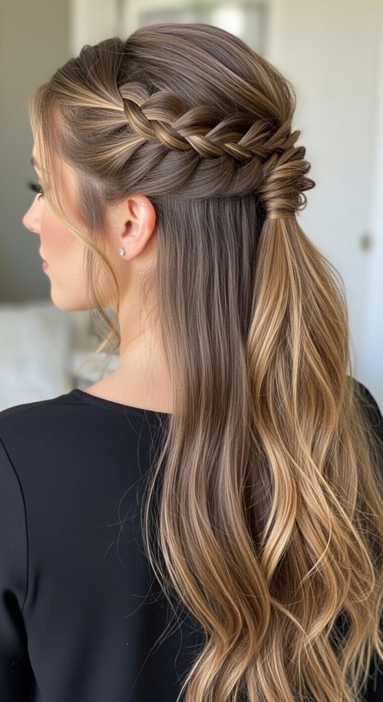 This hairstyle is elegant and versatile. Pull the top half of your hair into a ponytail, bun, or braid while letting the rest flow freely. Perfect for work, school, or casual outings.