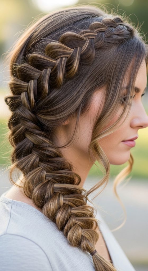 A side braid is simple yet stylish for long hair. Choose a classic three-strand braid, fishtail braid, or loose boho braid. Pull it gently to create volume and a relaxed vibe.