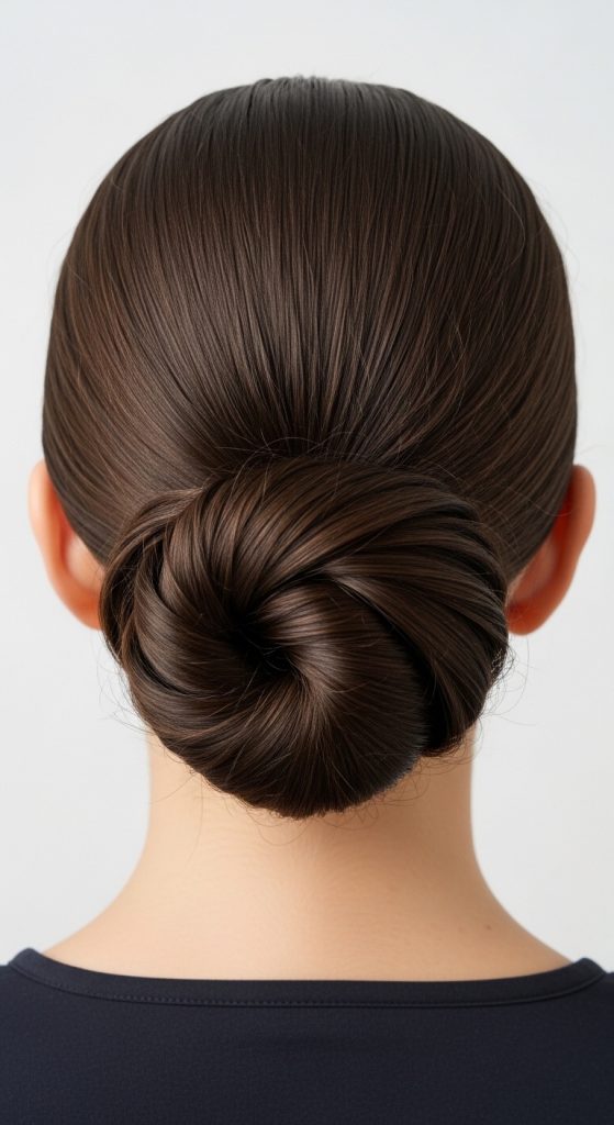 The low chignon is a sophisticated hairstyle for long hair. Twist hair into a low bun at the nape and pin securely. Add a few face-framing strands for softness. Perfect for formal events or weddings.