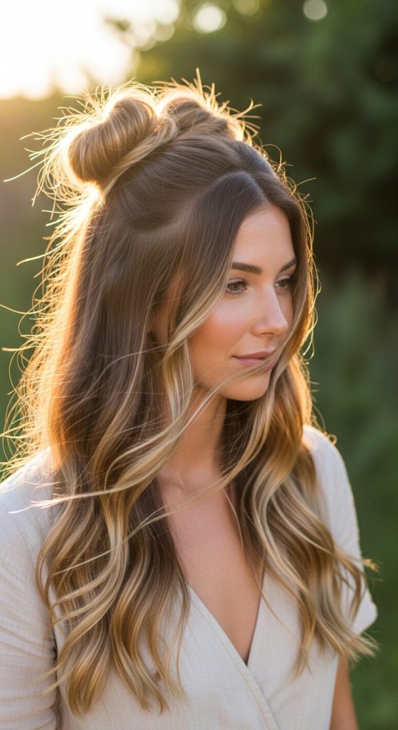Half-up two buns combine the best of both worlds: hair down and styled structure on top. This look is incredibly popular for casual settings, concerts, beach days, and social media photos. It allows you to show off your hair length while keeping the front sections controlled.