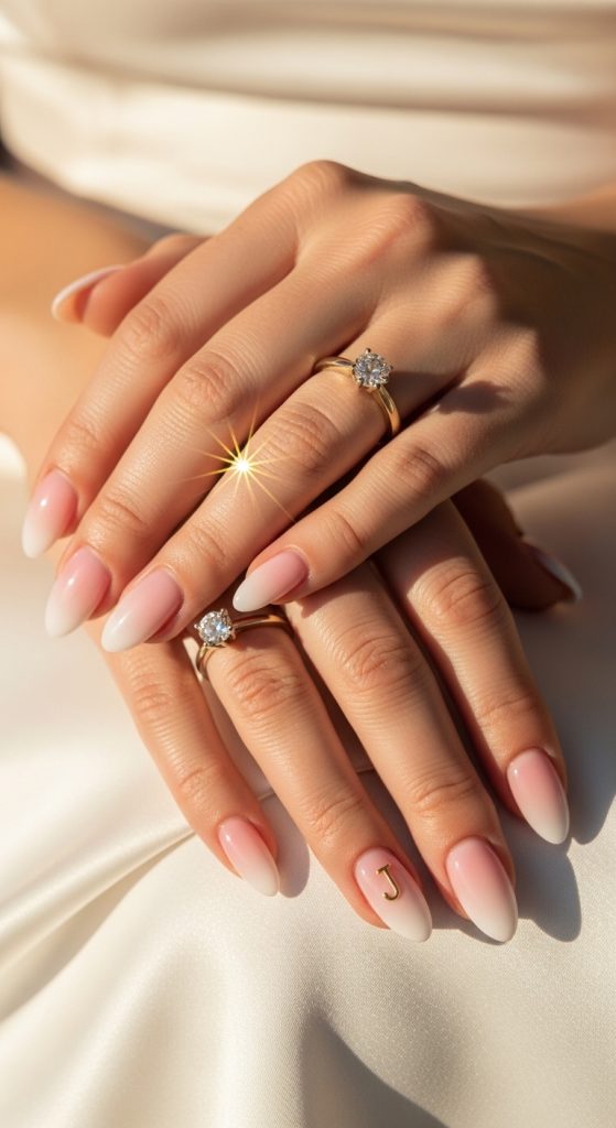 Soft ombre nails have long been a bridal favorite, but adding a personalized initial takes this engagement design to a new level. The ombre effect usually blends a sheer pink into a soft white, creating a delicate gradient that feels romantic and timeless. The uniqueness comes from placing a tiny initial—either your own, your partner’s, or both—on one discreet nail.