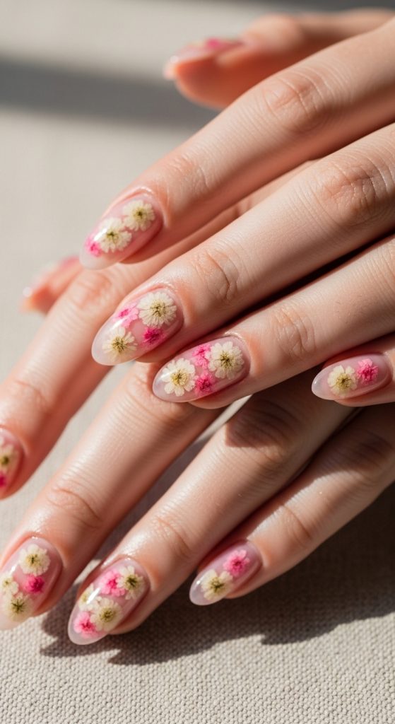 This engagement nail idea feels romantic and ethereal. Tiny dried flowers are embedded into a translucent base, creating a soft, natural look that feels timeless and meaningful.