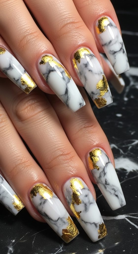 Gold foil marble nails mimic luxury stone textures with metallic accents. This design blends white, gray, and soft nude tones with gold foil flakes to create an artistic, high-fashion finish. Each nail looks unique, like wearable sculpture.