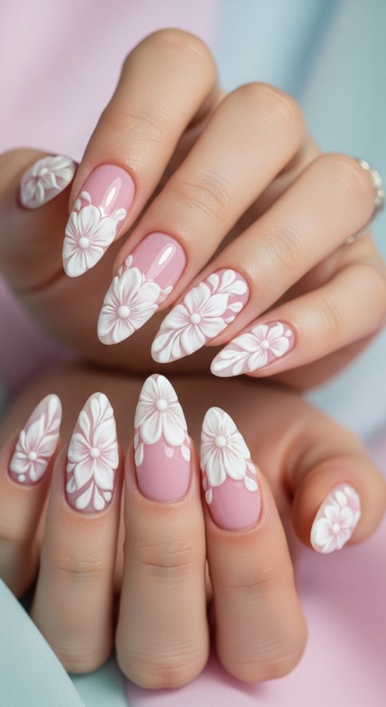 3D floral nails feature sculpted flowers that add texture and artistry. They look couture and handmade.