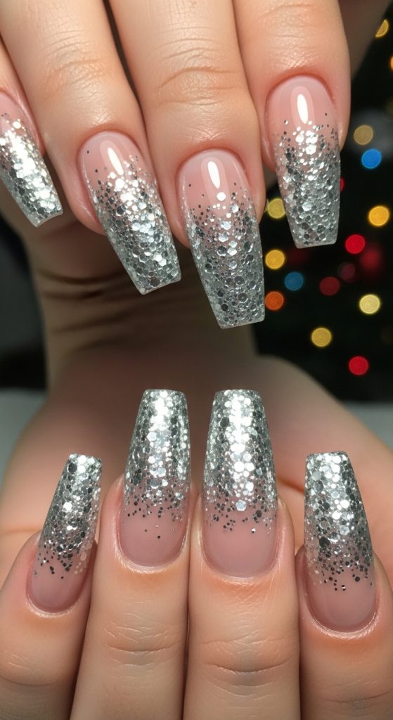 Glitter ombre nails blend sparkle into a smooth gradient. The glitter fades from the tip toward the base, creating a glamorous transition.