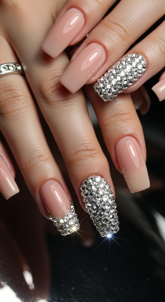 This design is perfect for weddings, formal events, or everyday elegance if you prefer refined sparkle. It balances simplicity and glamour, making it ideal for beginners entering fancy nail art.