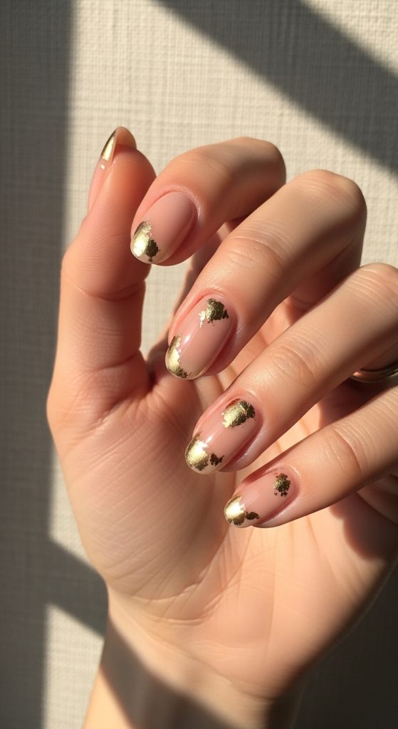 Apply nude polish. Paint thin gold lines or add foil accents. Seal glossy.
