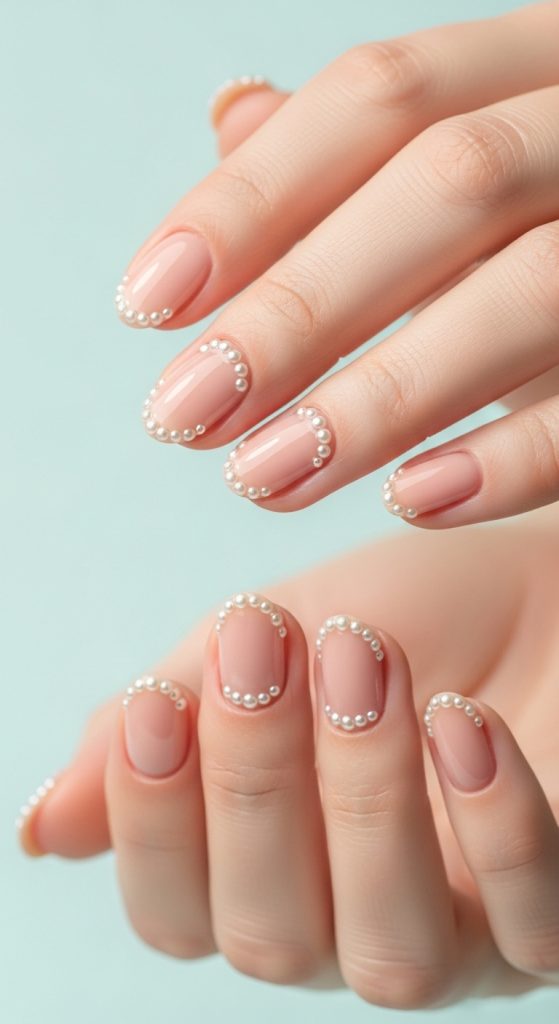 Pearl nails add soft elegance and bridal charm. Tiny pearls arranged near the cuticle or scattered lightly across the nail create a couture look.