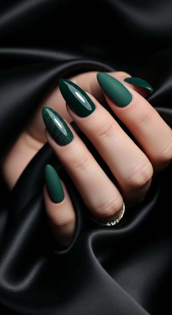 Velvet matte nails combine deep jewel tones with a soft matte finish. Emerald, sapphire, and burgundy shades look rich and luxurious. The matte texture contrasts beautifully with glossy accent nails or crystals.