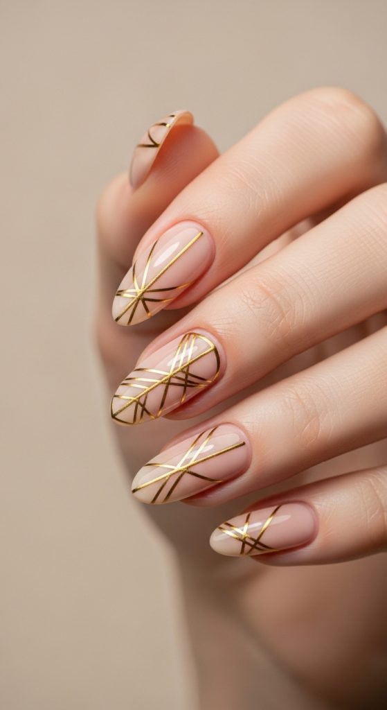 Thin metallic lines over nude polish create a sleek geometric design. Gold striping tape adds a clean, modern edge.