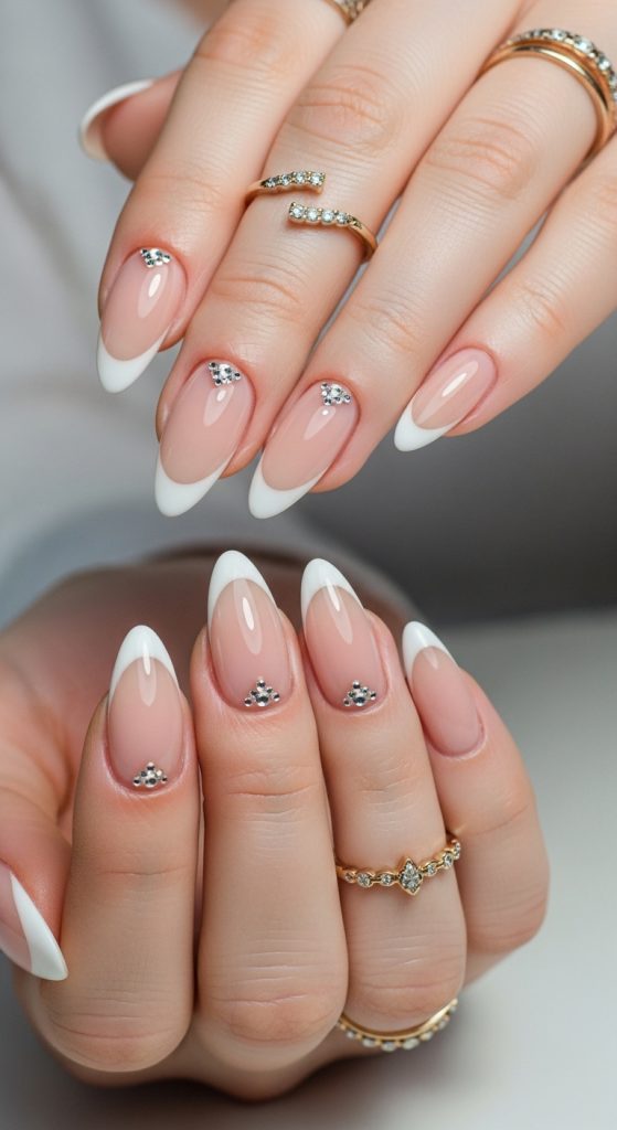 Start with clean, shaped nails and apply a base coat. Apply a nude or sheer pink polish as the base and cure or dry fully. Paint thin white French tips using a fine brush or French guide. Once dry, apply a small dot of nail glue or gel where you want crystals placed. Use tweezers to position rhinestones carefully. Cure if using gel. Seal lightly with top coat around the stones, not over them.