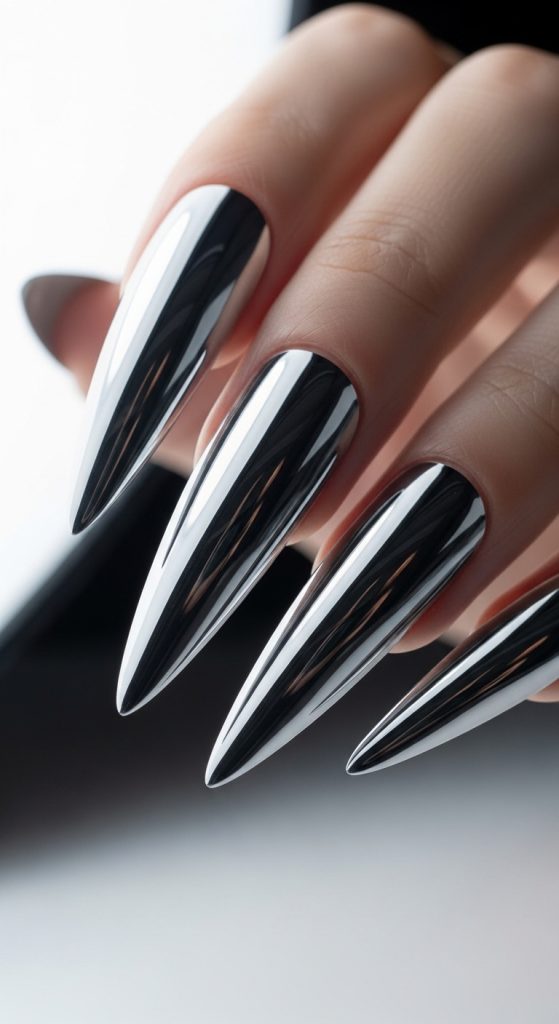 Chrome mirror nails are bold, futuristic, and ultra-glamorous. The reflective finish creates a liquid metal effect that captures attention instantly. Silver and rose gold chrome are the most popular fancy choices.