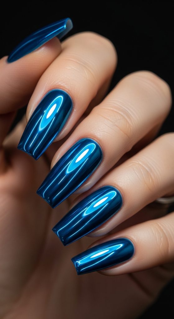 Blue chrome nails reflect light beautifully with metallic shine.