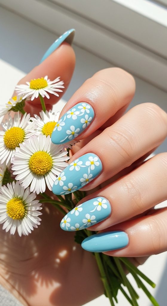 Blue nails with tiny white or pastel flowers feel fresh and feminine.